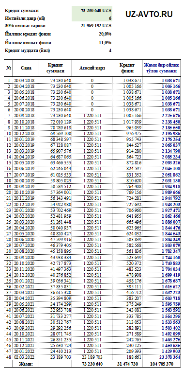 "AloqaBank" tomonidan taqdim etilayotgan avtokredit eng qulay bo'lib boshlang'ich to'lov atiga 30% ni tashkil etadi, qo'yiladigan 30 foiz ham yillik 11 foizlik omonotga qo'yiladi, kredit olish uchun bank shartlaridan tashqari sizdan faqatgina dillerdan shartnoma olib kelishingiz so'raladi. Eslatma omonatga 30% foizdan ortiq mablag' qabul qilmaydi agar siz 50% to'lamoqchi bo'lsangiz qolgan 20%zi kreditni qoplashga sarflanadi.