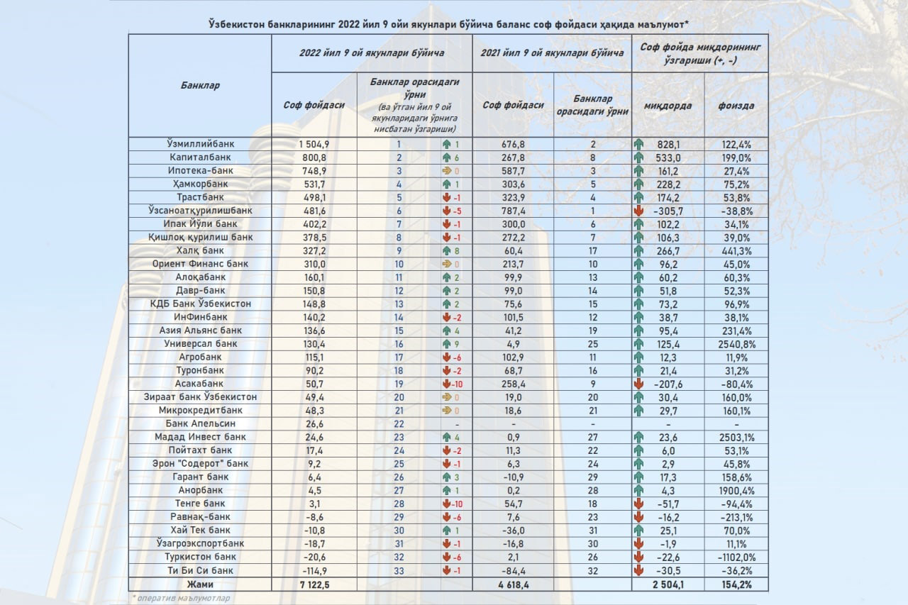 Чистая прибыль Национального банка, занявшего первое место по объему чистой прибыли, увеличила чистую прибыль в 2,2 раза по сравнению с соответствующим периодом прошлого года и составила 1,5 трлн сумов.