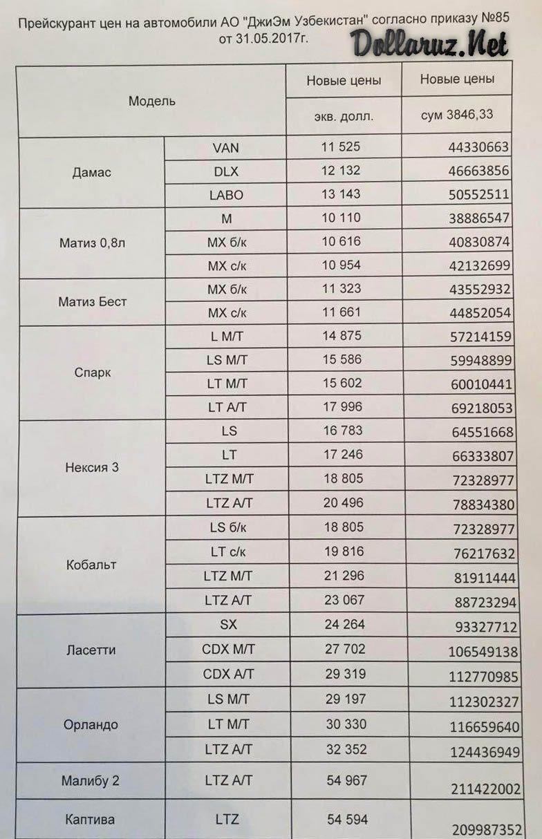 Xabaringiz bor Prezidentimiz qaroriga binoan 1-iyundan boshlab GM Uzbekistan 2017 yil avto narxlarini ichki bozor uchun sumda chiqardi va uni milliy valyutamizda sotib olish imkoniyati tug'ildi.